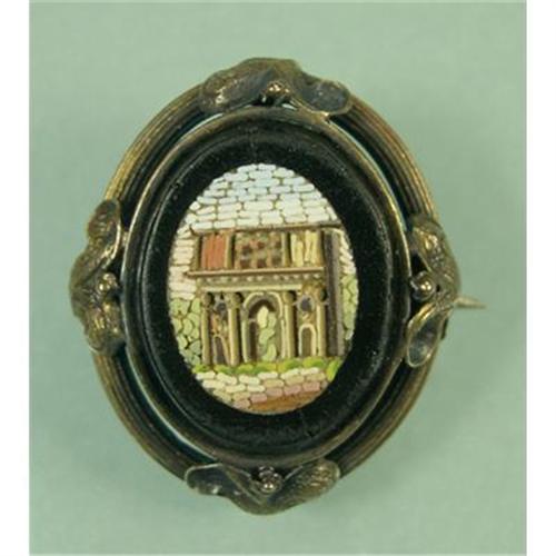 A beautiful example of architectural micro mosaic.  Depicting a Roman Arch and set in 14K gold and onyx.  C-Clasp in fine working order.  No missing tessare, some minor chipping to the edges of the onyx.