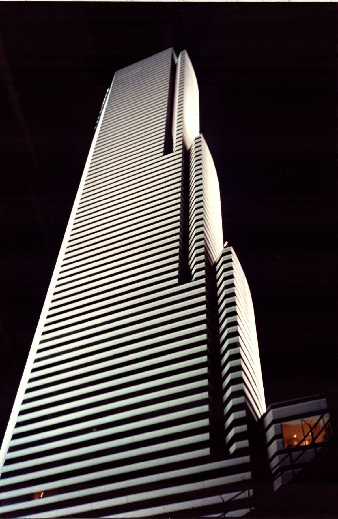 Large photograph on glossy Kodak photo paper. Depicts an upward perspective view of the Miami Tower at night. The Miami Tower is a 47 story skyscraper located in the Downtown district of Miami, Florida.