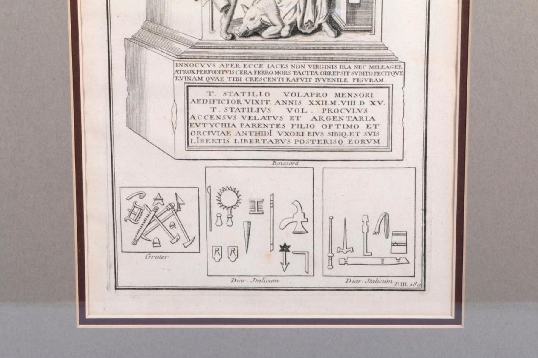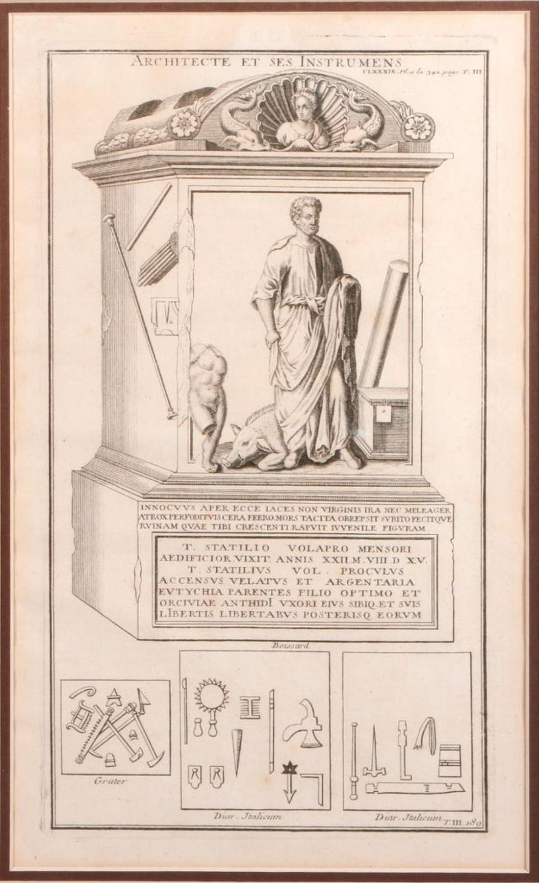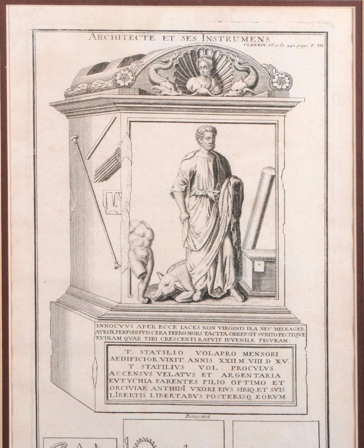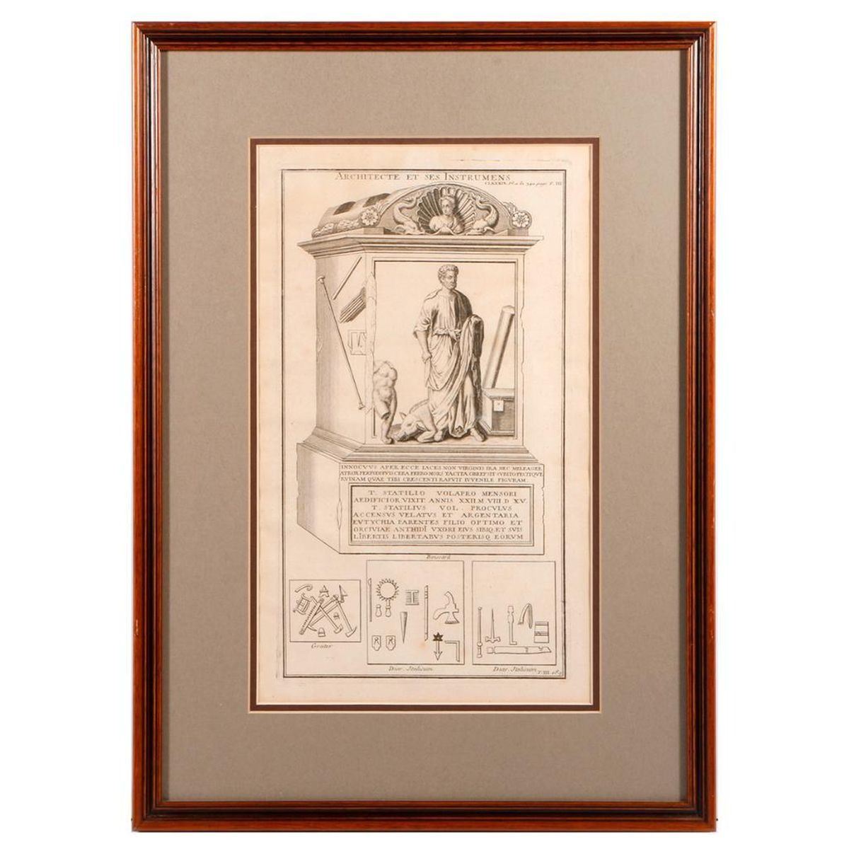 A late 18th / early 19th century architectural etching of an architect and his instruments. Image measures 131/2 inches high x 8, frame 20 inches high x 14 1/4.