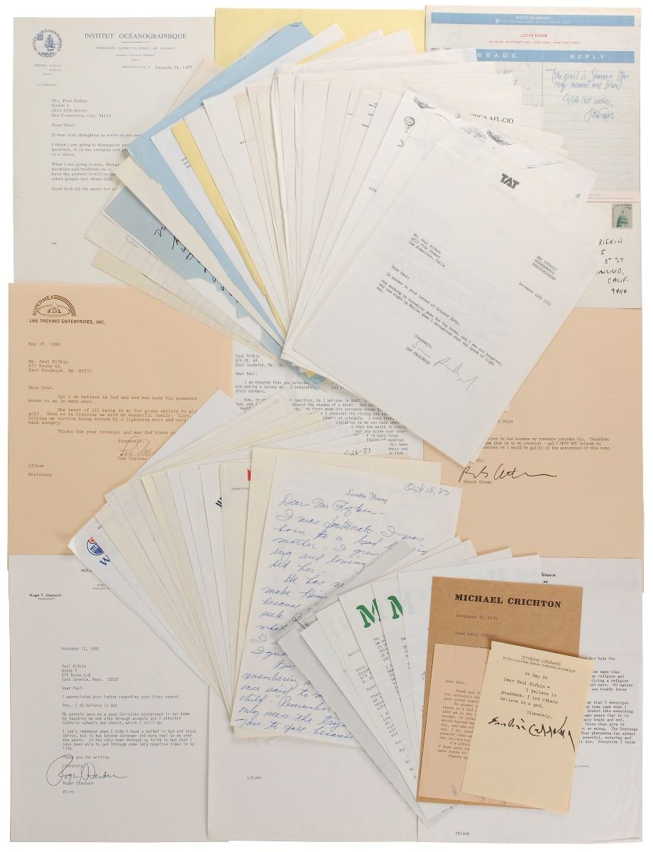 Remarkable collection of over 450 letters by celebrities and notable figures from a wide variety of fields, dated from 1976 to 1983, all written in response to the simple question: “Do you believe in God?” Represented within the collection are noteworthy actors, actresses, musicians, athletes, politicians, religious figures, scientists, businessmen, and more. The letters were compiled by Paul Rifkin, who wrote to prominent people posing as a fifth-grade student doing a school project. After receiving responses to his inquiry, he replied to reveal himself and ask for permission to publish their answers. With the approval of many respondents, Rifkin edited a compilation entitled The God Letters, published by Warner Books in 1986; a softcover copy of the book accompanies the collection. In overall very good to fine condition. Due to the large quantity a few other secretarial and/or printed signatures may be included. Interested parties are encouraged to view the collection in person at our offices or call us with specific inquiries, as this collection is sold as is and no returns will be accepted.A complete collection of images is available here: (A-D), (E-K), (L-Q), (R-Z)
