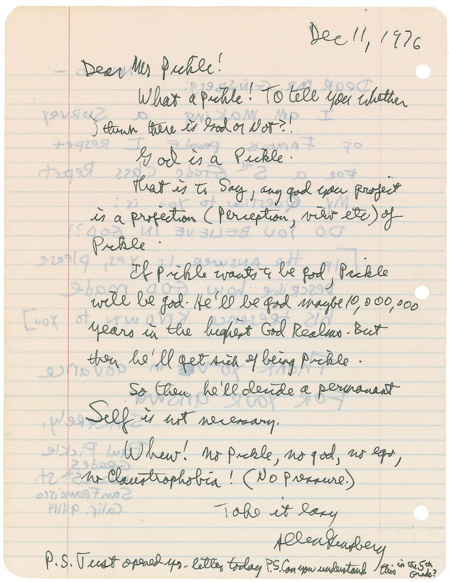 Allen Ginsberg: “God is a pickle…If pickle wants to be god, pickle will be god. He’ll be god maybe 10,000,000 years in the highest God Realms. But then he’ll get sick of being pickle. So then he’ll decide a permanent self is not necessary.”