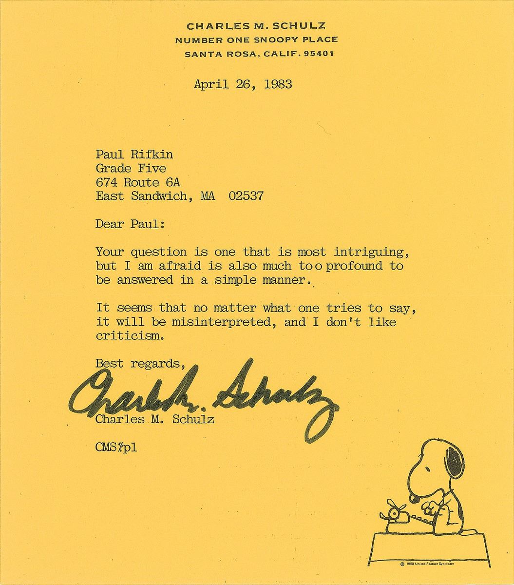 Charles Schulz: “Your question is one that is most intriguing, but I am afraid is also much too profound to be answered in a simple manner.”