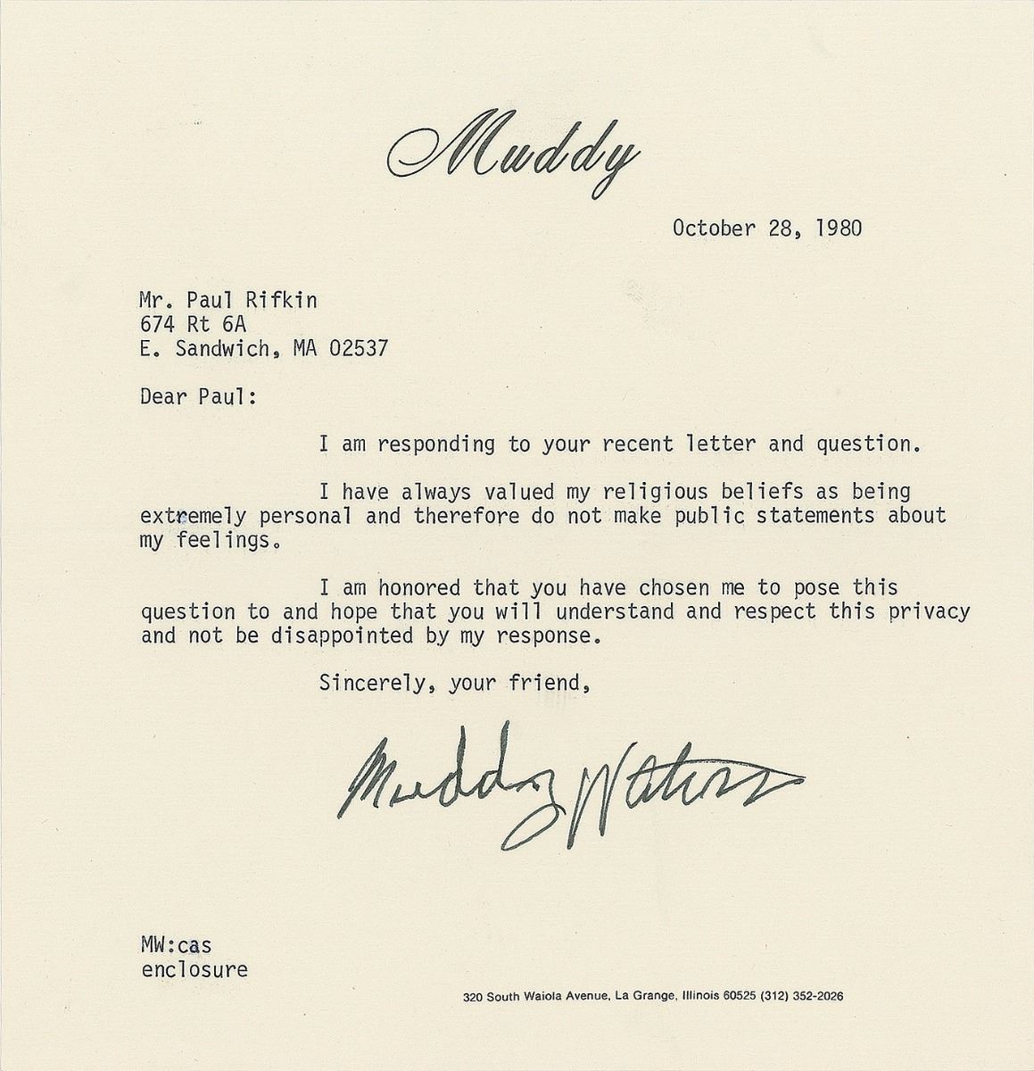 Muddy Waters: “I have always valued my religious beliefs as being extremely personal and therefore do not make public statements about my feelings.”
