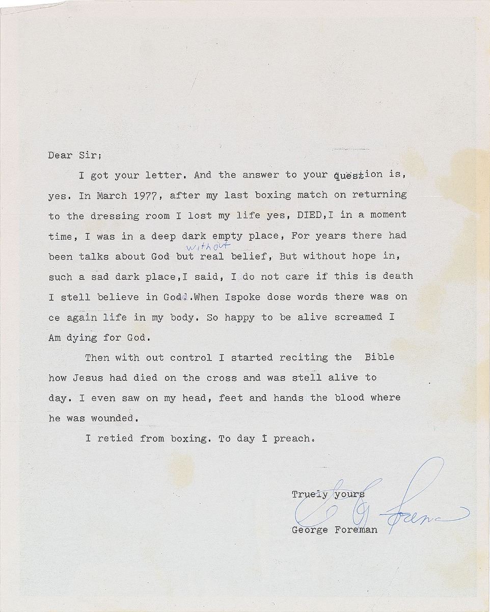 George Foreman: “After my last boxing match on returning to the dressing room I lost my life yes, DIED…I said, I do not care if this is death I stell believe in God. When I spoke dose words there was once again life in my body.”