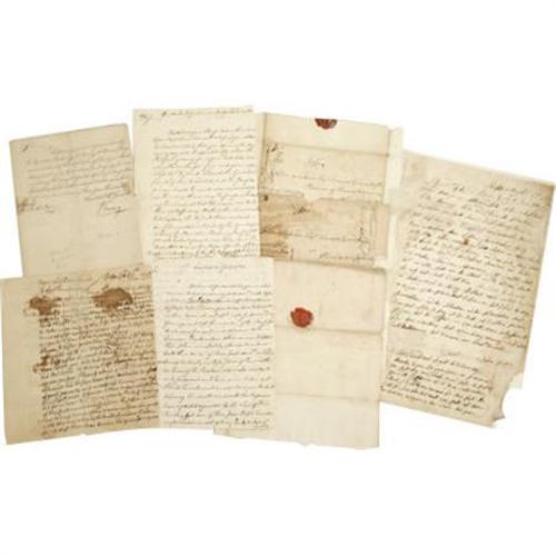 <B>Archive of Colonial Pennsylvania Correspondence.</B></I> A lot of five letters dating from 1755 to 1769, including: a one page, 6” x 7.5” letter, dated November 5, 1755 from a J. Vining to Lt. Governor Robert Hunter Morris, toned with a couple of areas of foxing, with the usual fold creases, else very good; a two page, 7.5” x 8” letter, dated March 17, 1757 from a “<I>Gra: Lloyd</B></I>” to Rachel Pemberton, tone with two large areas of foxing, splits at the folds, a few archival tape repairs, with the usual fold creases, else good; two letters, each 6.5” x 8.25”, dated February 3, 1769 and July 7, 1769 respectively, from William Thompson to John Lukins, Surveyor General, with original covers, toned with the usual fold creases, else very good; and a one page, 8” x 12.75” letter, dated 1762 from John Piper, tipped to a backing sheet, toned with a portion of the lower right corner missing, else good condition. <I>From the collection of Henry E. Luhrs.</B></I><BR><BR><b>Shipping:</b> Flat Material, Small (<a target="_blank" href="http://www.heritageauctions.com/common/shipping.php">view shipping information</a>)