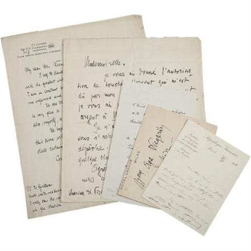 <B>Archive of Foreign Dignitaries Signatures</B></I>. Includes a one page autograph letter signed “<I>J. Bernstorff</B></I>” (Johann Heinrich von Bernstorff, German ambassador to the United States from 1907-17), 8.75” x 11.5”, February 25, 1930, wrinkled with small tears at the edges, extensive taped repairs on the verso, else very good; a one page autograph letter signed “<I>A. Millerand</B></I>” (Alexandre Millerand, French Minister of Commerce, Prime Minister and President), 4.25” x 5.5”, in French, on Minister of Commerce letterhead, September 27, 1901, with the usual fold creases, else near fine; an envelope signed “Manuel Roxas” (Philippine president), 9” x 4”, with Office of the President return address, postmarked August 9, 1946, slightly wrinkled else very good; a one page autograph letter signed “<I>Gabriel d’Annunzio</B></I>” (Italian fascist writer), 8.5” x 10.25”, in French, November 12, 1904, with the original transmittal envelope, toned with the usual fold creases, remnant of tape on the verso, else very good; autograph card signed “Leon Blum” (French Prime Minister), 5” x 3”, dated February 20, 1947, fine; a two page autograph letter signed “John Bright” (British statesman), 4.5” x 7.5”, December 18, 1868, with the usual fold creases else fine; autograph card signed by Norman Mantagu (Governor Bank of England); and one page autograph letter signed in the third person, in very good condition. <I>Ex. Henry E. Luhrs Collection</B></I>.<BR><BR><BR><BR><b>Shipping:</b> Flat Material, Small (<a target="_blank" href="http://www.heritageauctions.com/common/shipping.php">view shipping information</a>)