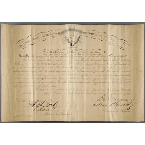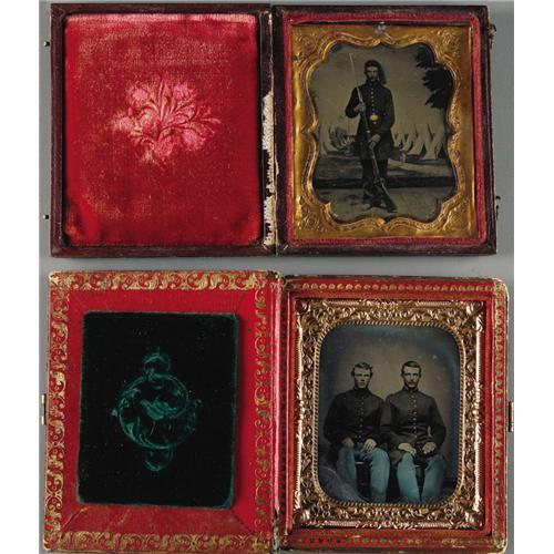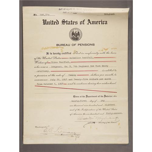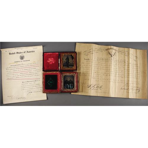 <B>Archive of Photos and Documents Relating to Sergeant Elias Westfall, 7th New York Heavy Artillery</B></I> including: cased tinted tintype of Westfall wearing a Zouave fez, 2.75" x 3.25", with clipped corners; a tinted tintype of Elias Westfall and his younger brother, John Westfall, Jr., 2.5" x 3", in a fine inlaid papier mache case, both men in nine-button frock coats; promotion document naming Elias Westfall sergeant, 15" x 10", June 6, 1865, Fort Federal Hall, signed by Lieutenant S. Loeb and Colonel R. C. Duryea; and, a two-page pension certificate of Catherine Westfall, widow of Elias Westfall, May 31, 1918. The promotion document is toned and folded, the case with the Elias Westfall is torn at the spine, and the papier mache case shows normal wear. Otherwise, all items are in very good condition.<BR><BR><b>Shipping:</b> Flat Material, Large (<a target="_blank" href="http://www.heritageauctions.com/common/shipping.php">view shipping information</a>)
