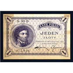 Poland, 1919 (1924) dated note, 1 Zloty, P-51 Issued note, Portrait of Kosciuszko on left. Uncirculated but the note has toning areas, the note is unp