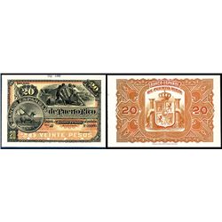 San Juan, Puerto Rico, ND (1889), 20 Pesos, P-10p, Unlisted Specimen, Series A, S/N 00000, Black on orange and yellow underprint, Paschal lamb on left