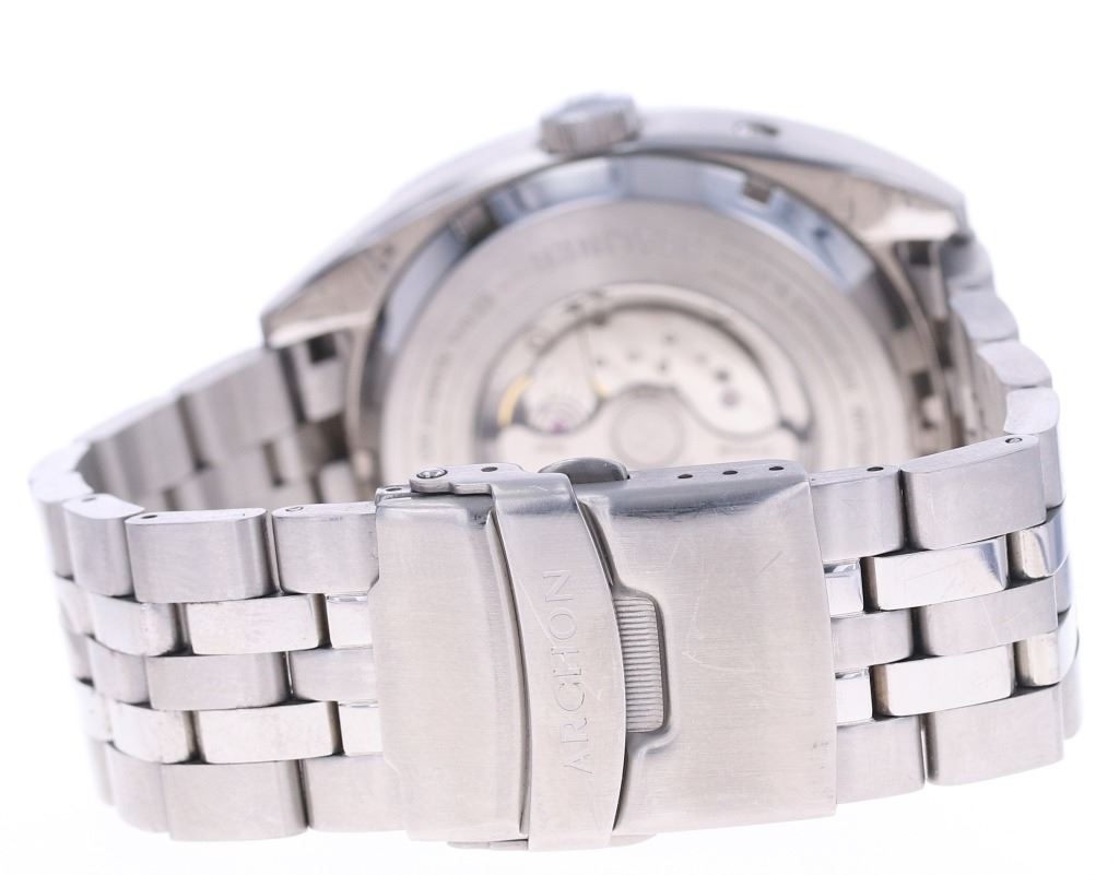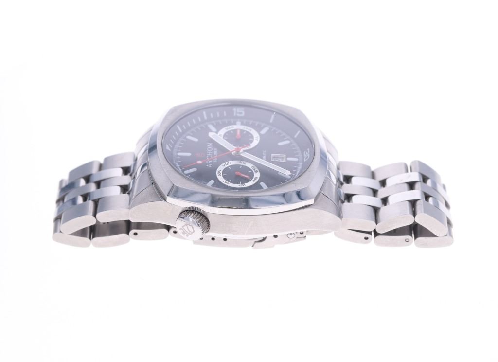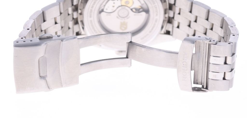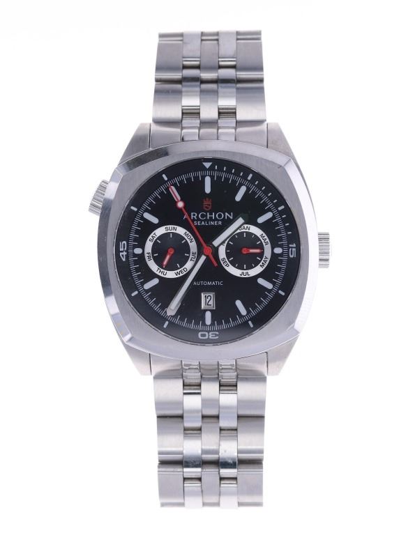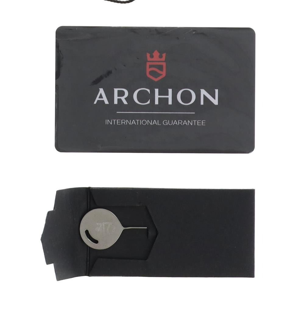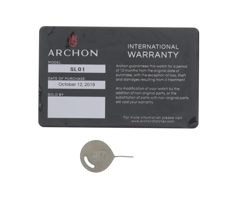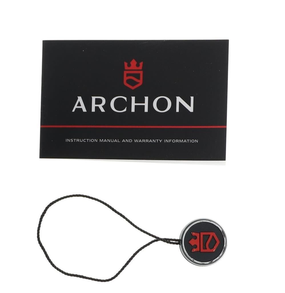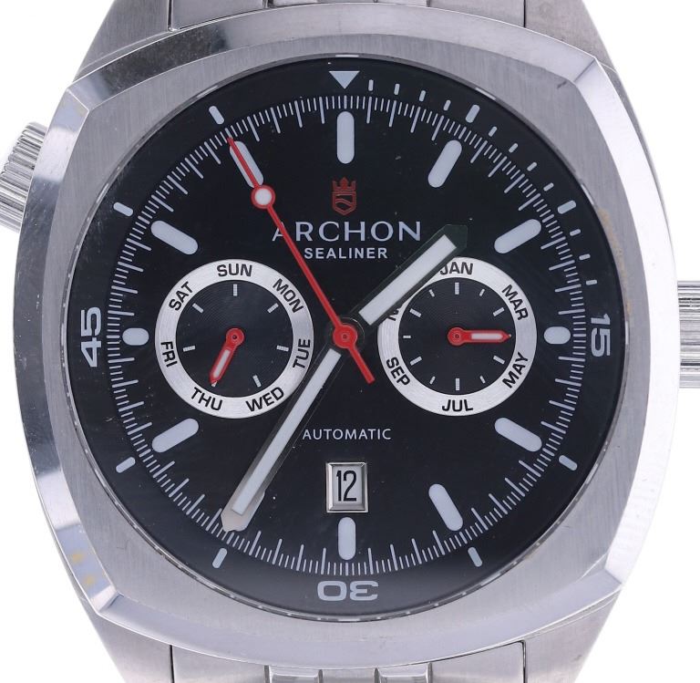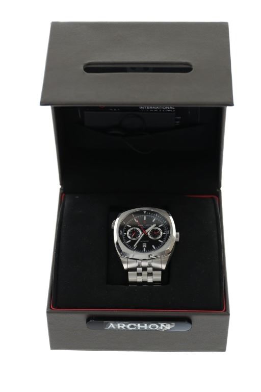 This is an original Archon Sealiner Model SL01 automatic 26 jewels 3-hand date (date, day of the week and month) automatic wristwatch / wrist watch with full kit box. Limited run watch with an original retail of $1,149.00. The watch shows a Miyota caliber 9122 automatic self-winding movement with 3-hand date, Power reserve of 40 hourse, 26 Twenty-Six Jewels and frequency of 28,800 VPH (4.0 hz). The watch features a 45mm diameter, 15mm height, 52.5mm lug to lug and weight of 242g (watch and band). The 3 Hands movement shows a date numerical window at the bottom with chronograph style two smaller dials, one for the day of the week and the other for the month of the year. The watch also shows a fantastic inner rotating bezel with accompanying Archon marked ridged crown found at 10 o’clock. The hands and indices have Superluminova for lowlight viewing. The watch is a true diver, safe to 20 ATM or 200 meters. The watch is crafted from 316L stainless steel with a flat sapphire crystal on the top and sapphire crystal on the back exposing the custom Archon marked rotating self-winding high beat automatic movement. The watch has an incredibly unique brushed and polished case with Archon marked crowns and locking side crown at 3 on a stainless-steel link bracelet showing polished and brushed finishes 24x22mm width and large double safety Archon marked clasp. The watch comes sin the original magnetic factory Archon box inside the larger Archon box with Archon tag, watch pillow, warranty card, manual and Archon tool for changing the band. The watch works perfectly, keeping good time and is in good condition with small handling wear marks. The box measures 5.5” by 5.5” by 4”. Total weight of 1 lbs 12 oz.