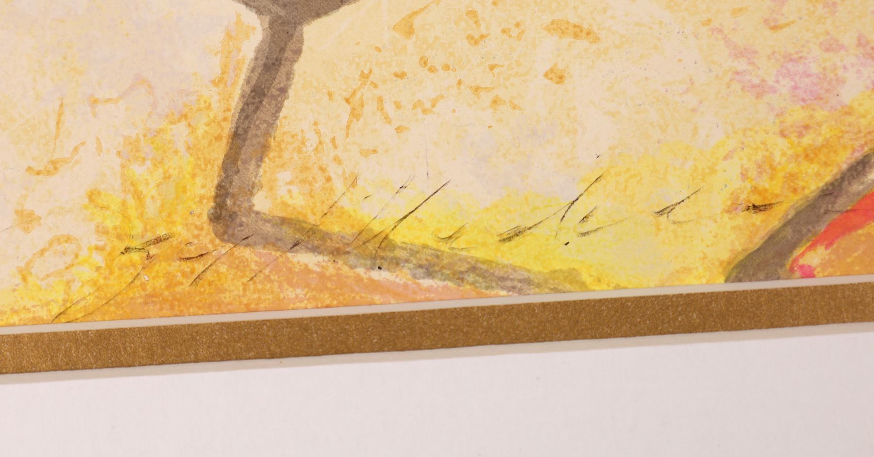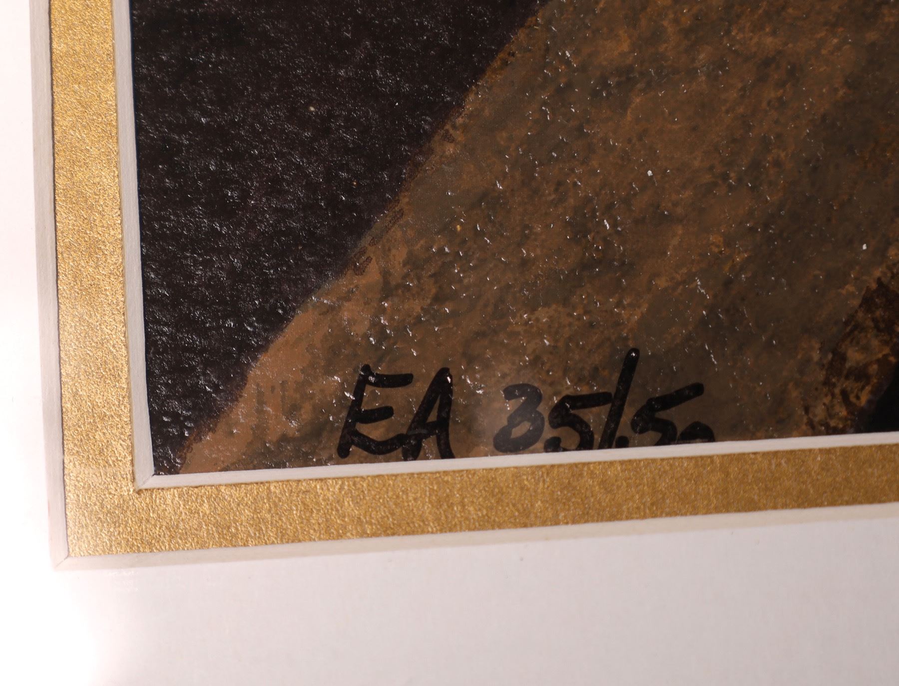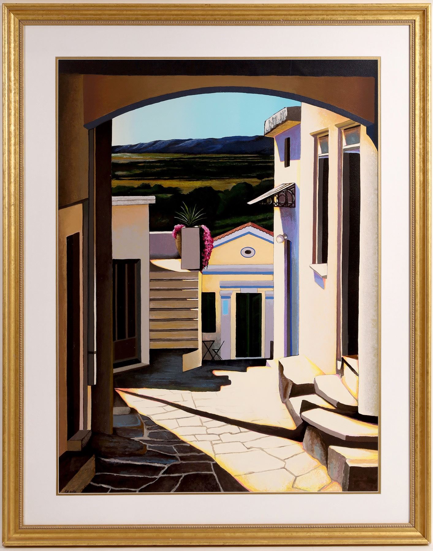 Beautiful serigraph by Medvedev (1931-2015) depicts the view through an archway to other buildings and the landscape beyond--35/50. Image--33" x 24", matted and framed-- 41" x 33".