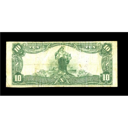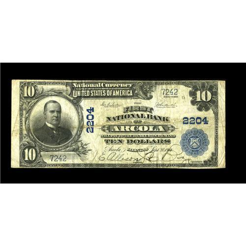 <B>Arcola, IL</B></I> - $10 1902 Plain Back Fr. 631 <B>The First NB</B></I> Ch. # 2204<BR>Eight large are reported from this institution off I-57 in central Illinois. This note has great signatures and exhibits several pinholes near the portrait and seal areas. <B>Fine+.</B></I><BR><BR><b>Shipping:</b> Coin/Currency (<a target="_blank" href="http://www.heritageauctions.com/common/shipping.php">view shipping information</a>)