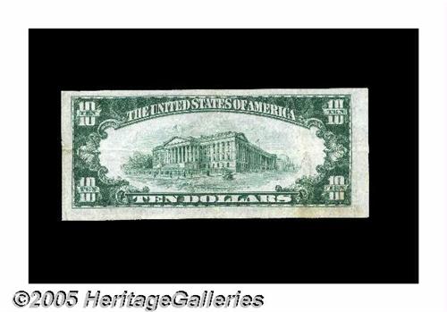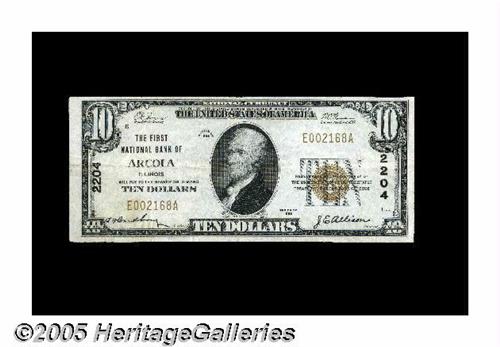 <B>Arcola, IL</B></I> - $10 1929 Ty. 1 <B>The First NB</B></I> Ch. # 2204<BR>In the 1929 series this sole issuer from here ordered only the $10 denomination in both types. <B>Very Fine.</B></I>