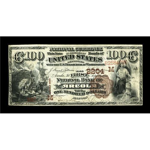 <B>Arcola, IL</B></I> - $100 1882 Brown Back Fr. 527 <B>The First NB</B></I> Ch. # (M)2204<BR>This example and one other $100 Brown Back are the only two early notes known from this one bank town, with this the finer of the pair. It's a pleasing <B>Very Fine</B></I> specimen, with the margins trimmed close all around. Expect bidding to easily reach and possibly well exceed...<BR><I>From The Lincoln Collection</B></I><BR><BR><b>Shipping:</b> Coins & Currency (<a target="_blank" href="http://www.heritageauctions.com/common/shipping.php">view shipping information</a>)