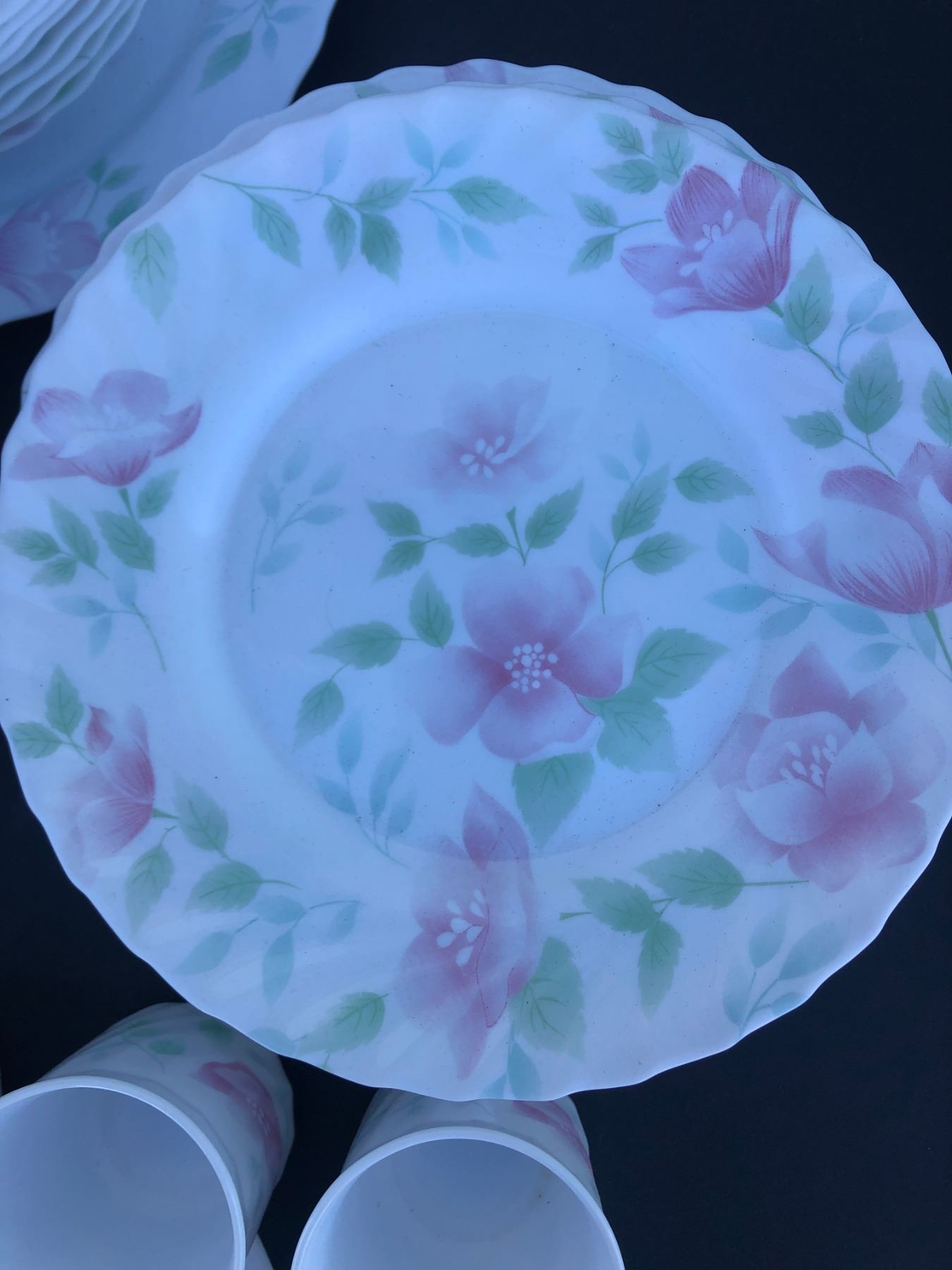 Plate setting for 8 includes coffee cups, tea cups, plates, saucers, 1 serving plate, 1 large bowl, creamer and 1 serving bowl