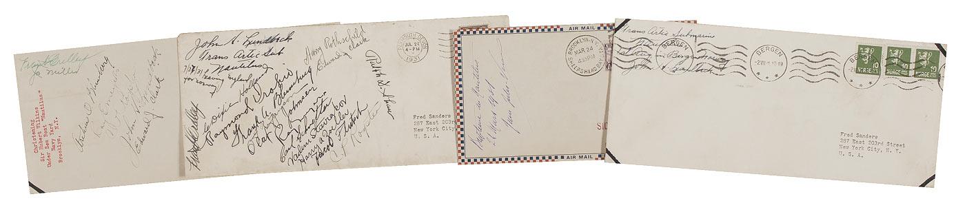 Interesting collection of four items each signed by at least one crewman of the 1930 Nautilus arctic expedition. Signers are: Jean Jules-Verne, John H. Lundbeck, Frank Crilley, J. Miller, Edward J. Clark, Arthur O. Blumberg, Ray E. Meyers, C. P. Royster, Harry Rothchild, Ralph Shaw, Dixie Holland, Raymond W. Drakio, J. R. Janson, Olaf Johnston, Carl Schnetter, Vadim Stavrakov, Harry A. Zoeller, and Jacob Fleutsch. Accompanied by two unsigned commemorative covers from the 1931 Wilkins-Ellsworth Trans-Arctic submarine expedition. In overall fine condition, with even toning, mounting residue and scattered soiling. According to our consignor, several of the crew member signatures were unknown until just a few years ago.