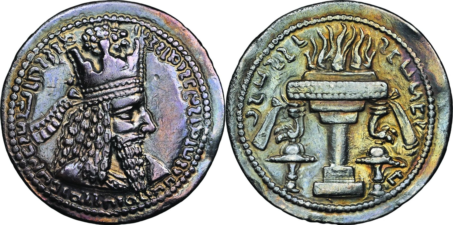 Revers : NWR' ZY 'rtḥštr en pahlavi, autel du feu (flammes 2) avec des diadèmes (type G). Ref : SNS type V(4a)/3a(2b), Göbl type IV/2, Saeedi –, Sunrise 720 var. (pellet avant la couronne).