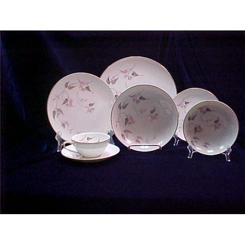 </font></strong>The Arden pattern (#5603) by Noritake China has pink flowers with gray leaves and stems. This pattern was discontinued in the late 50s and early 60s. The 88-piece set includes one 16-1/4" platter, one 12-1/4" platter, one 10" oval vegetable bowl, one 9" covered vegetable bowl, one 9" gravy boat with attached underplate, 12 - 10-5/8" dinner plates, 12 - 8-1/8" salad plates, 11 - 6-3/8" bread and butter plates, 12 - 8-3/8" soup bowls, 12 - 5-5/8" berry bowls and 12 cup and saucer sets. All pieces are in very good condition. The year made is unknown.</font>