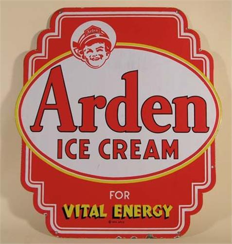 "Arden Ice Cream" 2 sided, 4 color, die cut, porcelain sign. Some chipping around the edge, otherwise Ex. cond.
