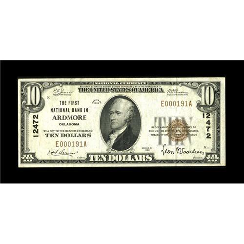 <B>Ardmore, OK</B></I> - $10 1929 Ty. 1 <B>The First NB</B></I> Ch. # 12472<BR>Although chartered in 1923, this institution elected to issue Series 1929 examples only before liquidating in 1933. Just eight notes make up the entire census, with this the finest of that small group. <B>Very Fine-Extremely Fine.</B></I><BR><I>From The Rolling Plains Collection</B></I><BR><BR><b>Shipping:</b> Coins & Currency (<a target="_blank" href="http://www.heritageauctions.com/common/shipping.php">view shipping information</a>)
