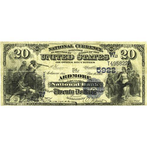 <B>Ardmore, OK</B></I> - $20 1882 Value Back Fr. 583 <B>The Ardmore NB</B></I> Ch. # (W)5922<BR>A scarcer Ardmore bank which issued Second Charter examples only before closing in 1917. This is one of only two $20 Value Backs listed in the Kelly census, and the nicer of the pair. <B>Fine,</B></I> with the bottom margin trimmed a touch close.