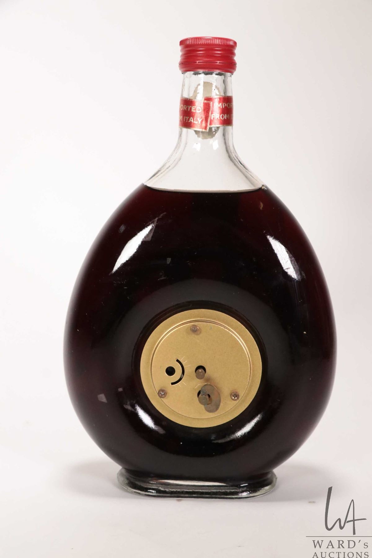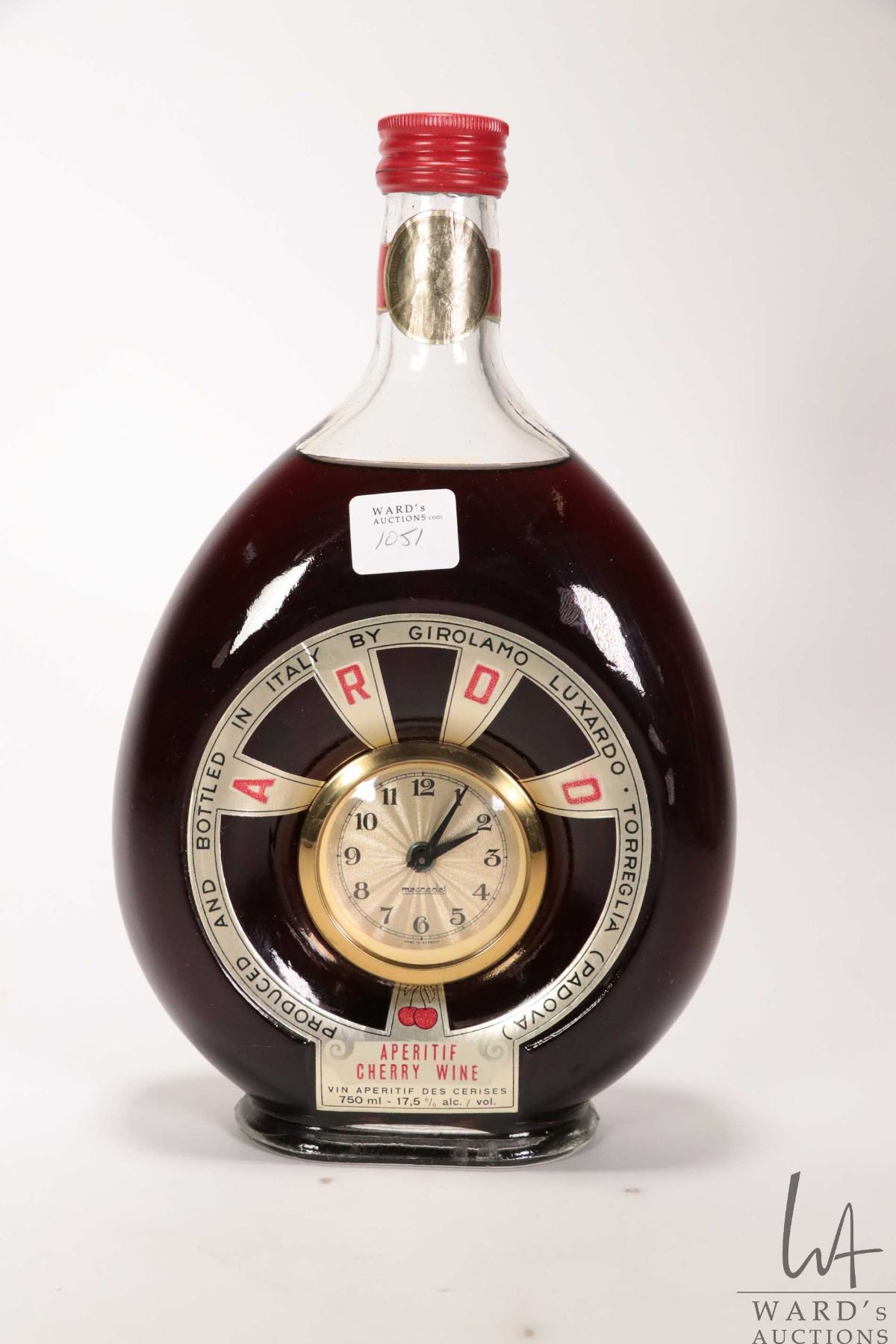 Ardo/ Girolamo Luxardo/ Italian Cherry Wine/ Collector bottle with clock ( working at time of cataloguing/ 750ml/ 17.5% ABV Note: Alcohol cannot be insured by any courier in Canada. Local pick up is recommended. Canadian bidders only.