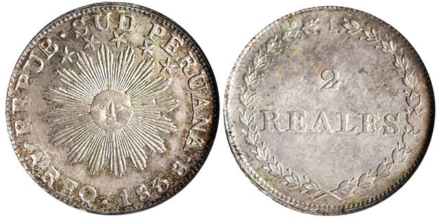 Arequipa, South Peru, 2 reales, 1838, encapsulated NGC MS 62, tied for finest known specimen graded