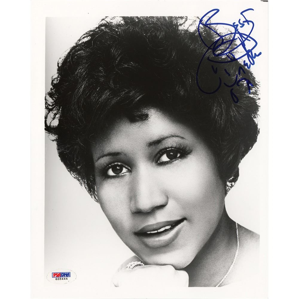Glossy 8 x 10 close-up photo of the 'Queen of Soul,' signed in blue felt tip, "Best, Aretha, 07." In very fine condition, with a PSA/DNA label affixed to the lower left corner (certificate not present).