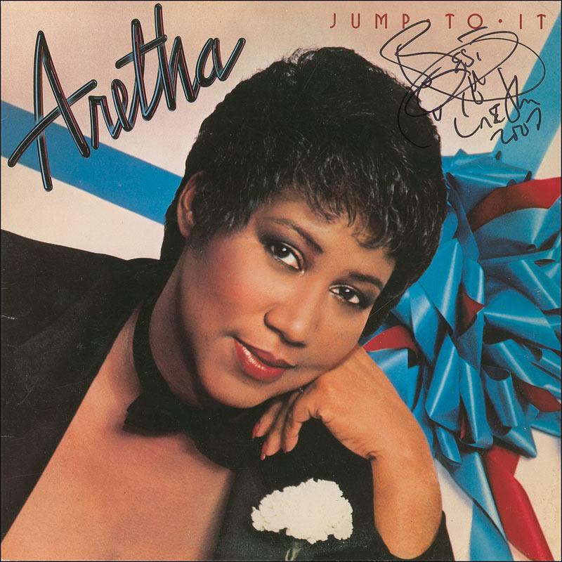 Jump to It album signed in black felt tip on the front cover by Aretha Franklin. Scattered creases, otherwise fine condition. The record is not included.