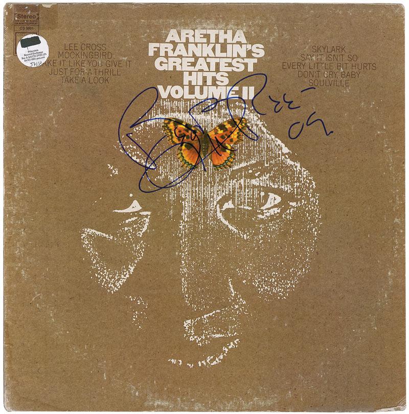 Aretha Franklin’s Greatest Hits Volume II album signed on the front cover in blue felt tip. Light ‘ring of wear’ to cover, scattered edge wear and creases, and an old label to top left, otherwise fine condition. The record is included.