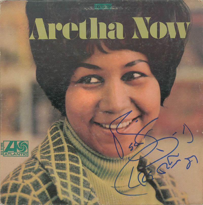 Aretha Now album signed on the front cover in blue felt tip. Scattered light wear and rubbing to front cover, and scattered toning and soiling to back cover, otherwise fine condition. The record is included.