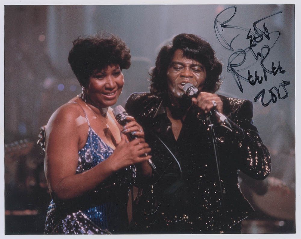 Color glossy 10 x 8 photo of Franklin performing with James Brown, signed in black felt tip. In fine condition.