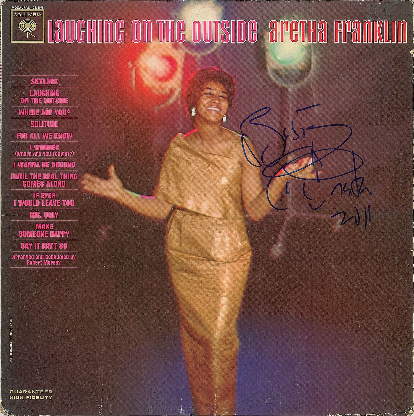 Laughing on the Outside album signed on the front cover in blue felt tip, "Best, Aretha, 2011." In fine condition. The record is included. Consignor notes that the signature was obtained at the Cleveland Marriott Hotel after her appearance at the Rock and Roll Hall of Fame.