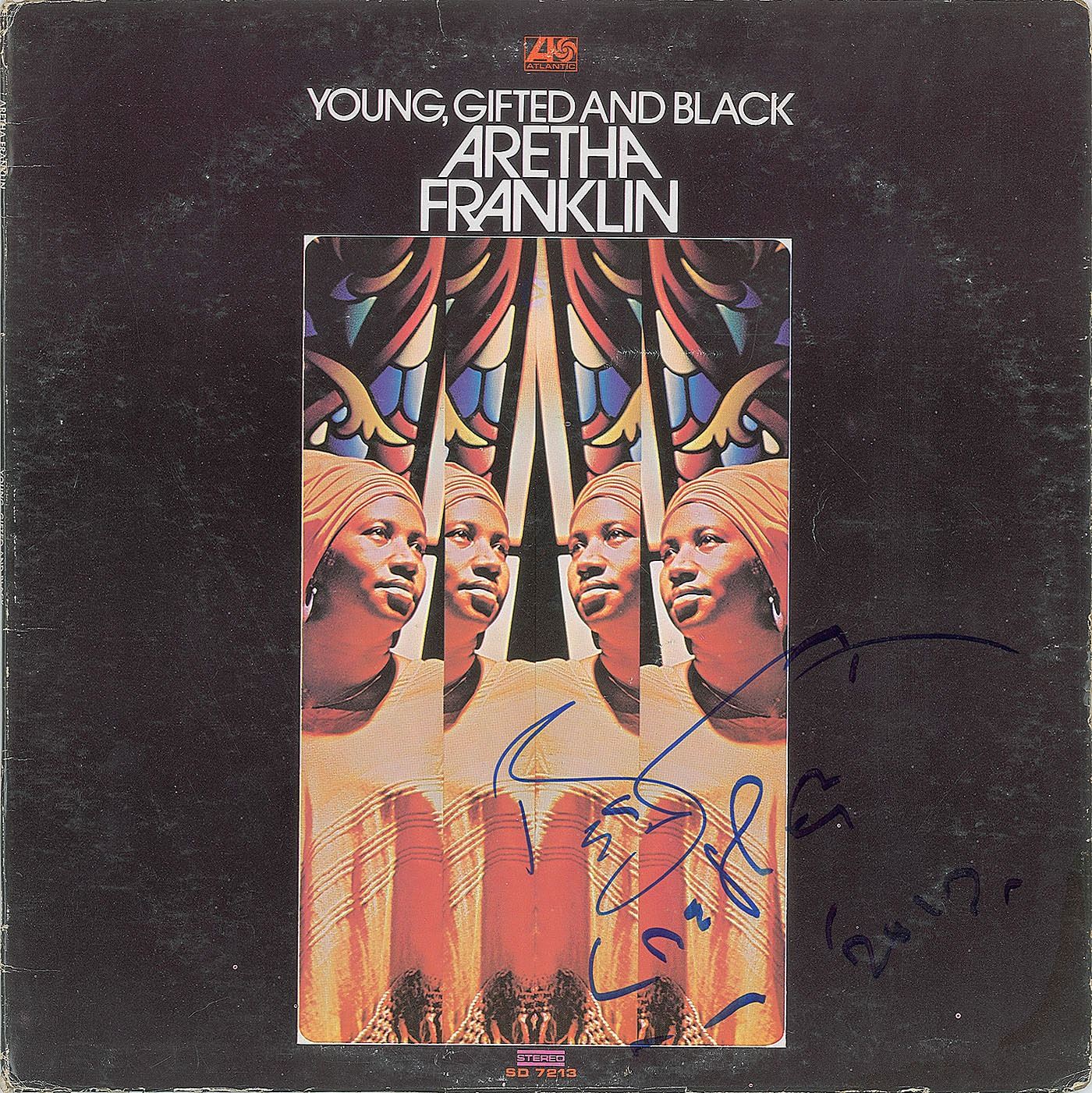 Young, Gifted and Black album signed on the front cover in blue felt tip, "Best, Aretha, 2017." In very good to fine condition, with light scuffing and edge wear. The record is included. Accompanied by a full letter of authenticity from JSA.