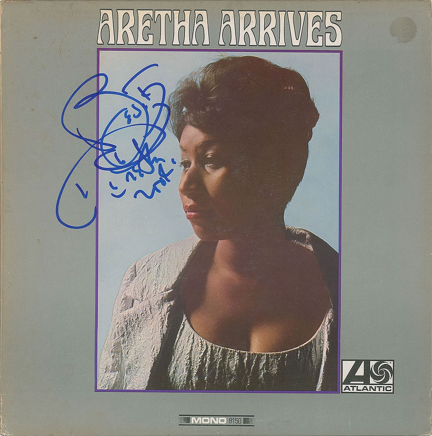 Aretha Arrives album signed on the front cover in blue felt tip, "Best, Aretha, 2004." In fine condition, with a circular area of old price sticker residue. The record is included.