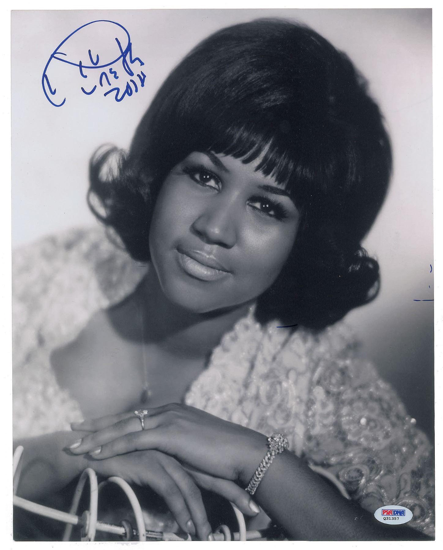 Satin-finish 11 x 14 close-up photo of the revered soul singer, signed in blue felt tip, "Aretha, 2018." In fine condition, with small stray ink marks to the right edge, and a PSA/DNA label affixed to the lower corner. Accompanied by a certificate of authenticity from PSA/DNA.