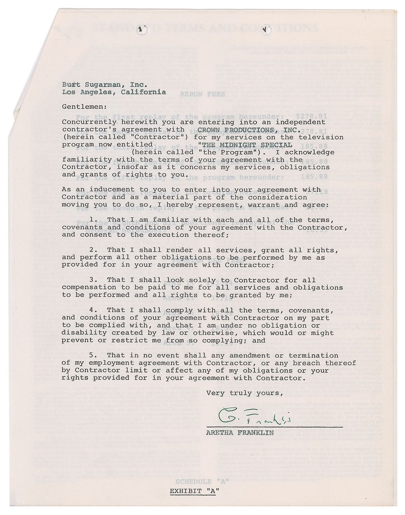 DS, signed “A. Franklin,” three pages, 8.5 x 11, no date. An AFTRA 'Standard Terms and Conditions' statement, with attached Exhibit 'A' supplement issued to Burt Sugarman, Inc., regarding a contractor's agreement with Crown Productions, Inc., for the services of Aretha Franklin on "the television program now entitled 'The Midnight Special.'" Signed at the conclusion of the supplement in green ink by Franklin. Stapled to the back is a schedule of 'Rerun Fees' and 'Foreign Use Fees.' In fine condition.