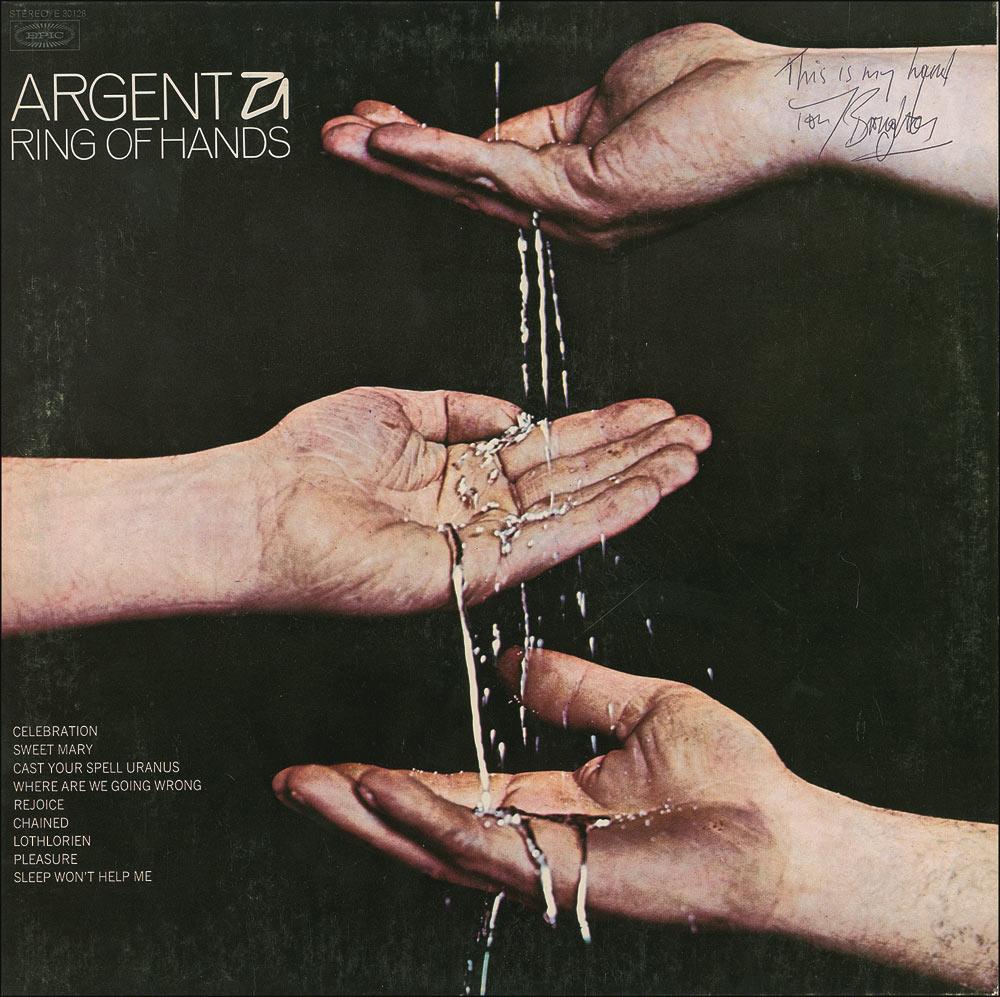 Ring of Hands album signed and inscribed in ballpoint on the inside gatefold by Rod Argent, and signed by Russ Ballard, Robert Henrit, and Jim Rodford. In fine condition, with some light wear to cover and gatefold, and another signature on the front cover, belonging to the owner of one of the hands in the photo. The record is included. RRAuction COA.