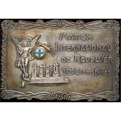 A large silver plaque issued in 1903 at the International Shooting Match for Revolvers. The medal measures 127.1 x 57.4 mm. Weight is uncertain since it cannot be removed from its case. Victory is standing at left, adjacent to a blue and white circular lo