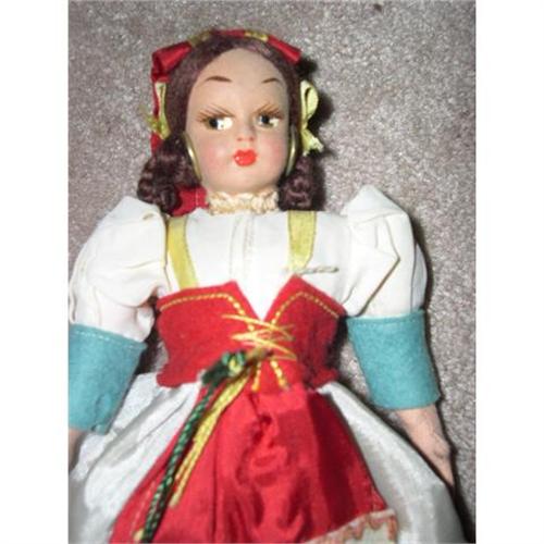 Here is a geat 9" doll to represent Argentina. the tag says BS.AS. Elios Florencia Industria Argentina. She has auburn mohair with braids looped on each side. She has hoop earrings. She has a fuzzy material over the formed face. She has black eyed and red dots in the nostrils. She has painted upper eyelashes. She moveable legs and floopy arms. The hands have molded lines to represent the finges. She has an attached slip and panties. She has ref felt shoes with cardboard soles sewn on. There are a couple of little holes in the blue felt used as cuffs on the dress. She is very clean and shows well. She is from a smoke free environment. Buyer to pay $8 for U.S. shipping, insurance and handling. Thanks for viewing.