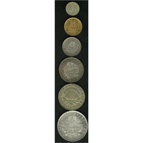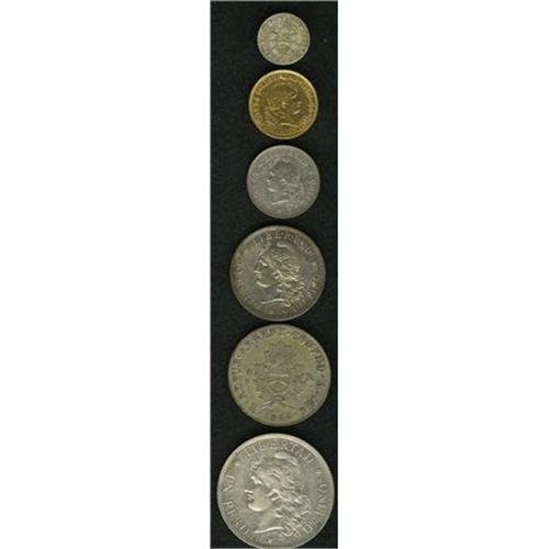 <B>Confederation & Republic Type Selection,</B></I> La Rioja KM22 1/2 Real 1854B toned XF and KM20 4 Reales 1846RV toned AVF, Republic KM27 20 Centavos 1882 toned XF, KM28 50 Centavos 1883 toned AU, cleaned at one time, Peso KM29 1882 lightly cleaned XF and KM31 gold Argentino or 5 Pesos 1888, XF, ex-jewelry, no mount marks but surfaces appear polished from wear in a bezel. <B>Sold as is, no return lot.</B></I><BR><BR><b>Shipping:</b> Coins & Currency (<a target="_blank" href="http://www.heritageauctions.com/common/shipping.php">view shipping information</a>)