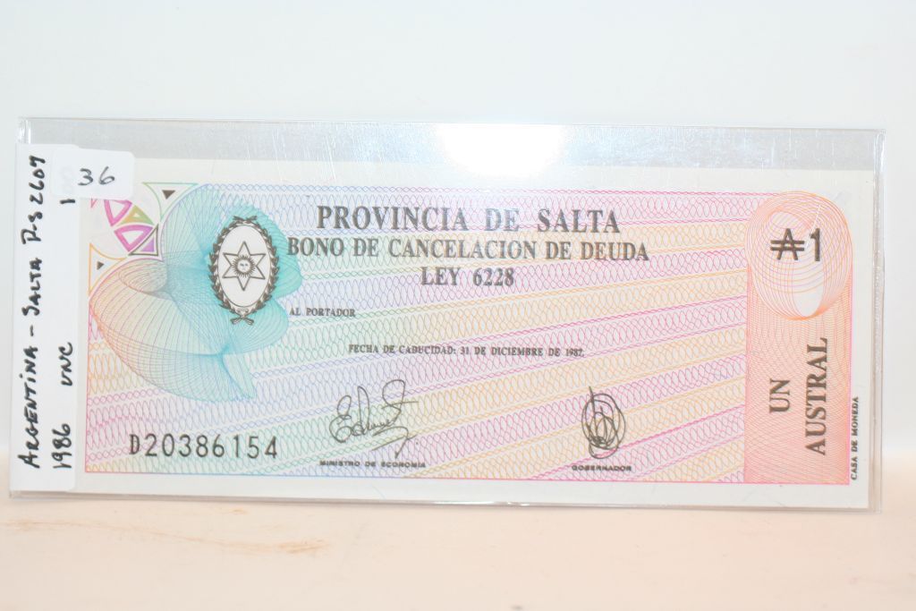 This lot is a 1986 argentina-salta 1 austral note