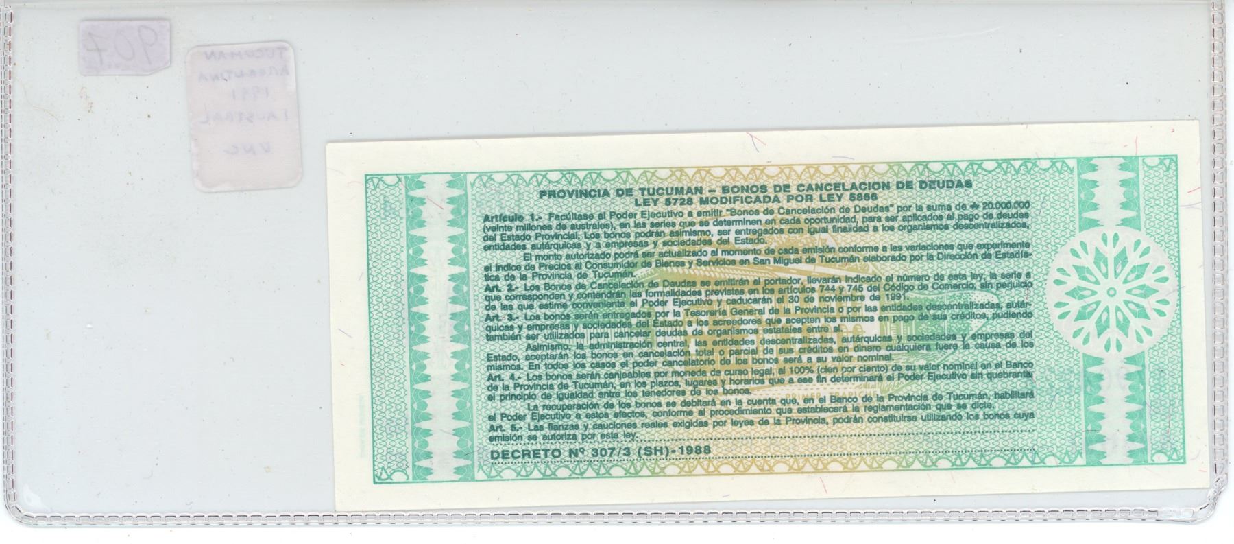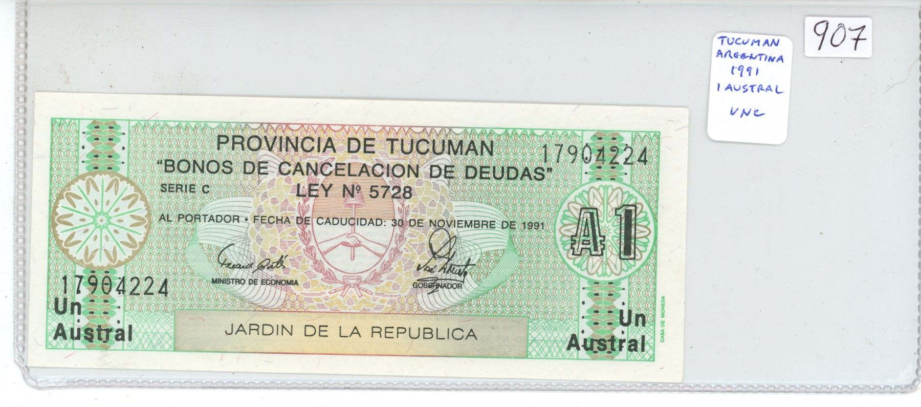 Argentina. Province of Tucuman. Good for the Cancellation of Debt. 1991 1 Austral. Uncirculated.