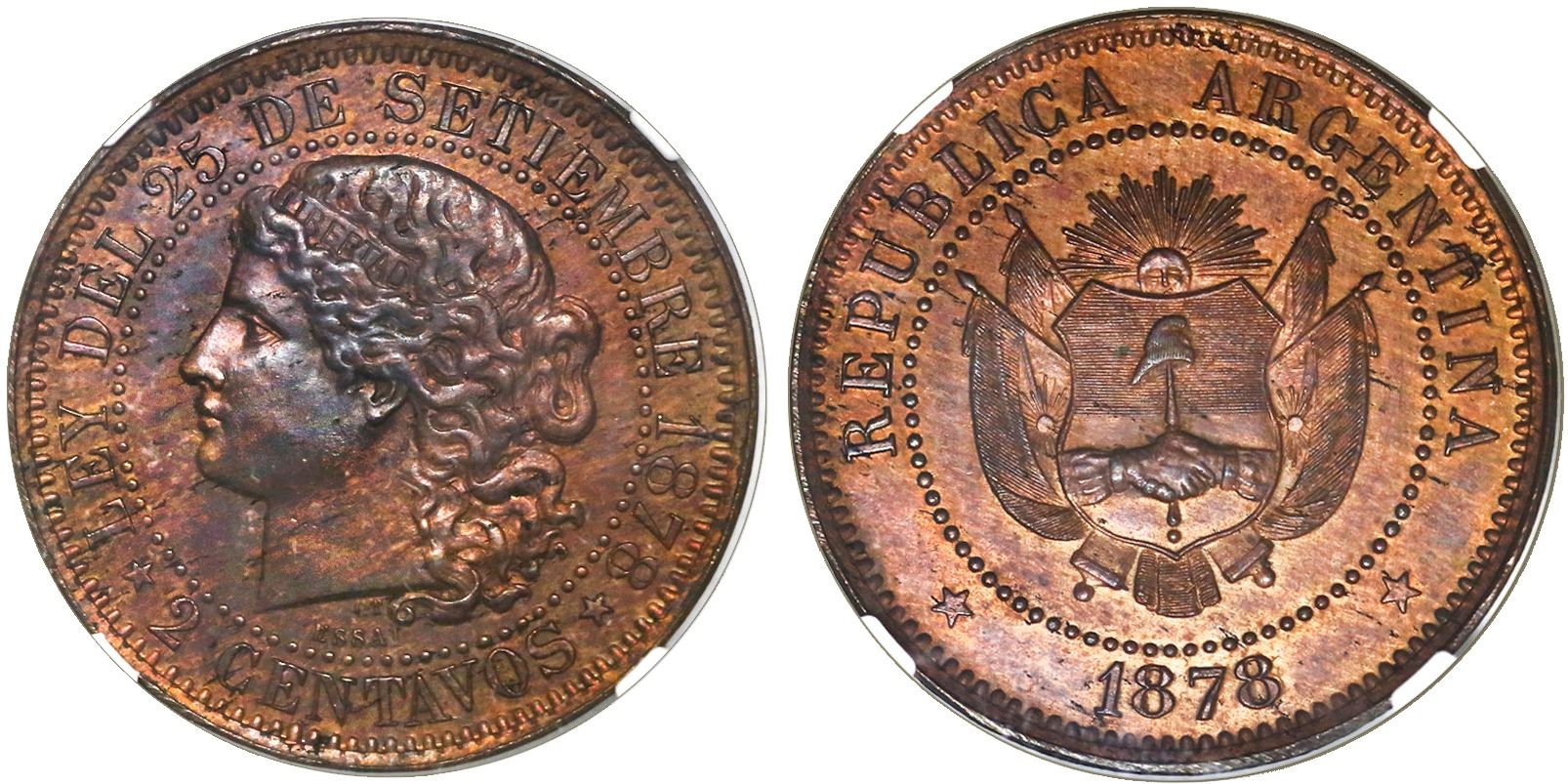 Argentina, copper essai 2 centavos, 1878, NGC MS 63 RB.