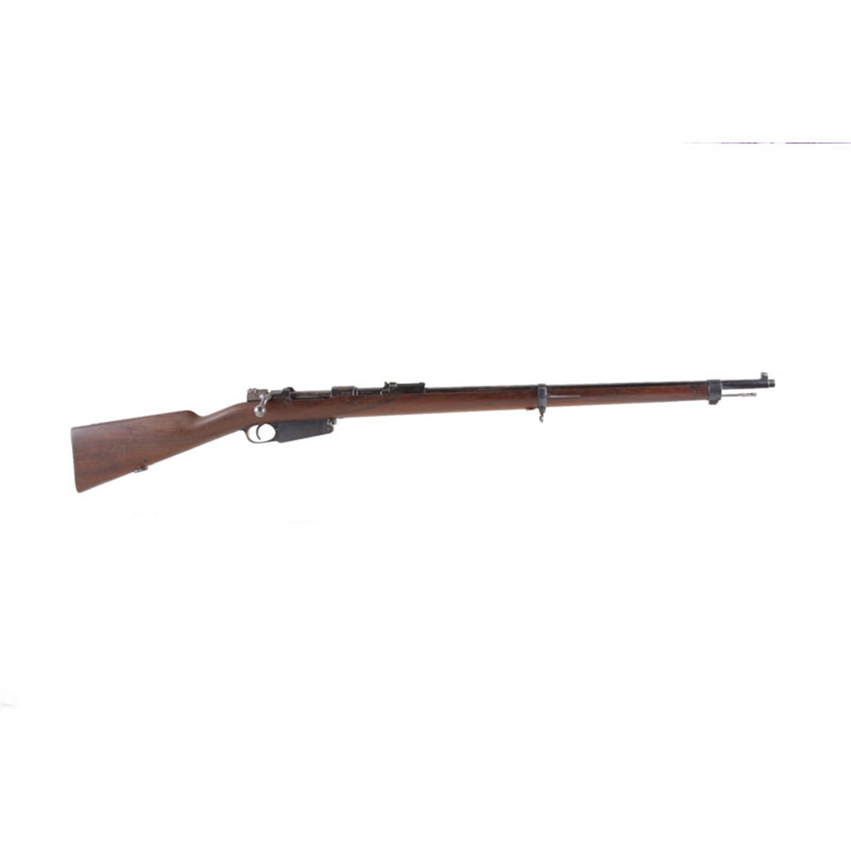 Argentine 1891 Mauser Cal 7.65x53 SN:E3251 Bolt action military rifle made in Germany for the Argentine Army. Blued finish, smooth wood straight grip stock with no hand guard and steel butt plate, 29" barrel with ladder style military sight graduated toBolt action military rifle made in Germany for the Argentine Army. Blued finish, smooth wood straight grip stock with no hand guard and steel butt plate, 29" barrel with ladder style military sight graduated to 2000meters, good bore and action. Barrel and receiver numbers match but nothing else. Argentine crest has been ground off. Condition: Good to very good with no import marks. A few scattered rust spots but notmuch use.