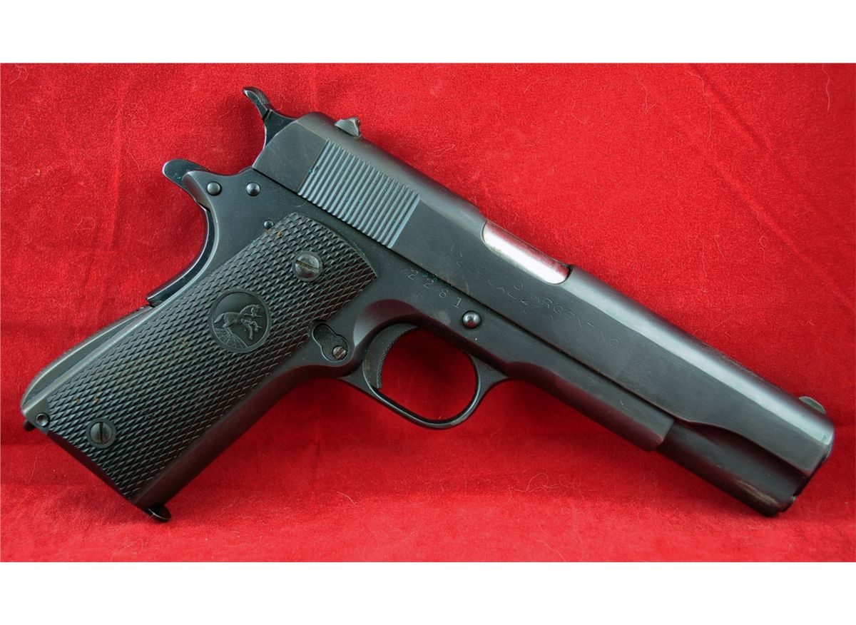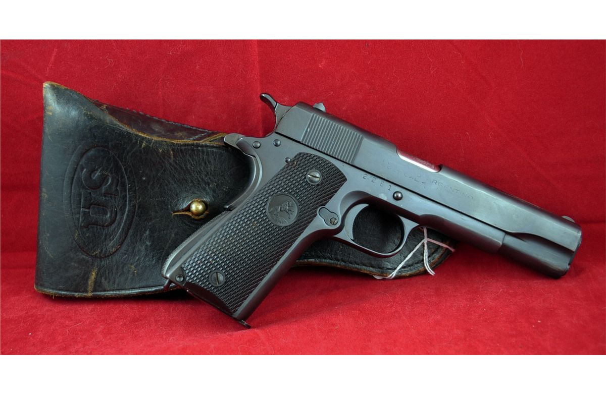 Argentine Contract Colt Mod. 1927 Semi-Automatic 45 ACP Pistol, Limited Production of 10,000, Mfg. 1927, Ser.#2281, The left side of the slide is marked with the two line address/1897-1913 patent dates.The right side is marked "EJERCITO ARGENTINO. In black leather U.S. Military marked holster. See photos for more information. Pistol looks to be in good condition and has probably been professionally restored. Kennedys Auction Service has not attempted to test fire any gun in this auction and all guns are sold in "AS IS CONDITION" and are not guaranteed to be operational.