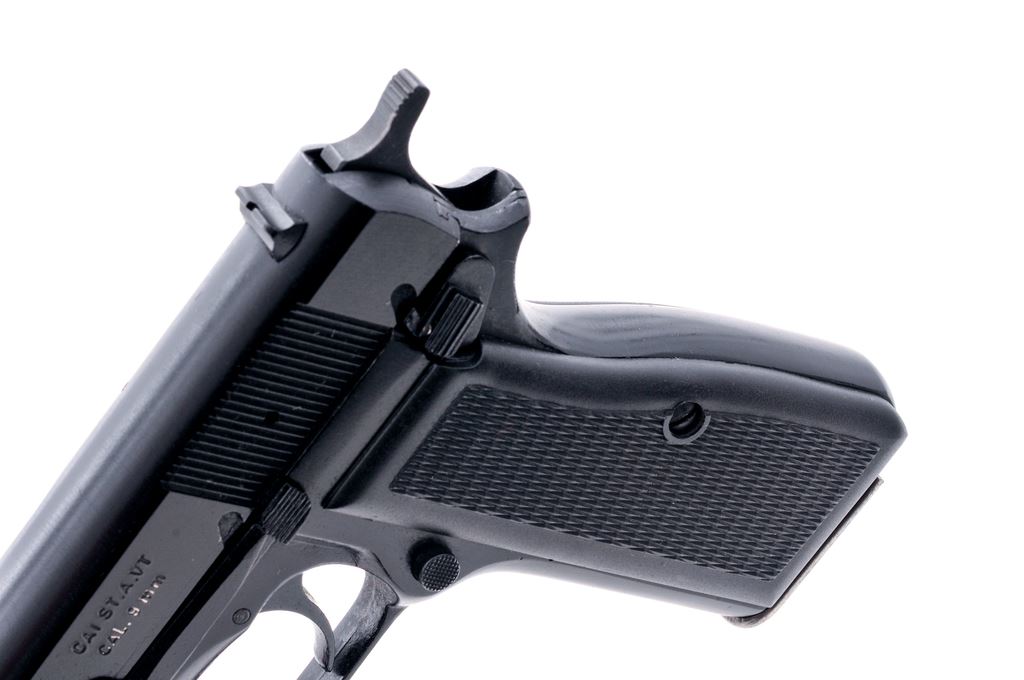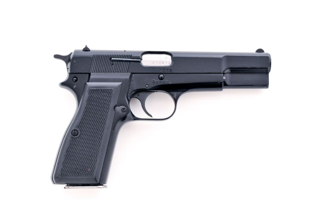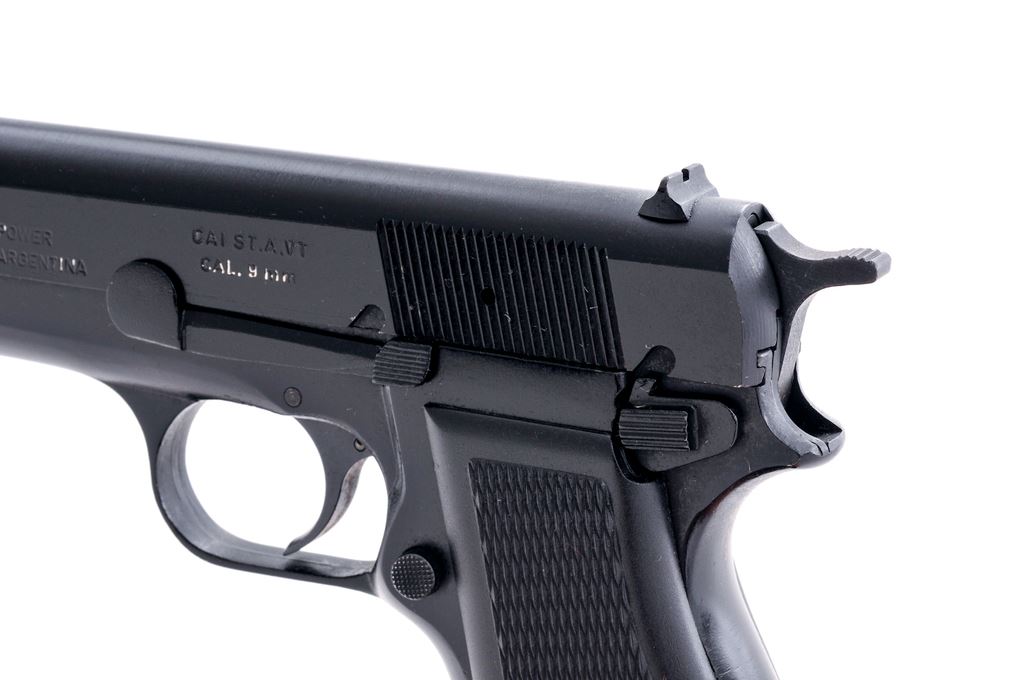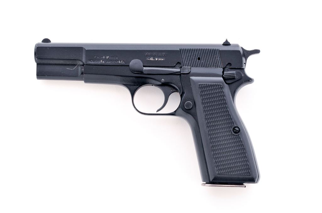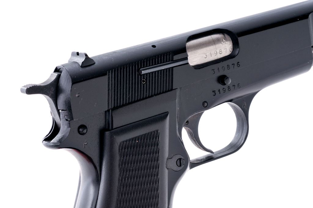 Argentine FM Hi-Power Semi-Automatic Pistol, #319876, 9mm, 4.75'' barrel, black finish, standard fixed sights, checkered black plastic grips, with one high capacity magazine. Frame, slide, and barrel with visible matching numbers. Left side of slide is import marked. In excellent overall condition showing light handling marks and retains approx. 99% black finish. Grips are also excellent. Magazine is most likely not original to the pistol as it shows finish wear to the edges of the base as well as the body. Action is smooth, with a bright bore that shows evidence of very little use. Est.: $350-$550. (Modern/PPT) (High capacity mags not available to Calif. residents.) (Joe Poyer collection)