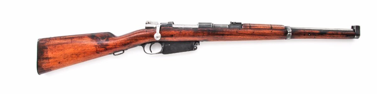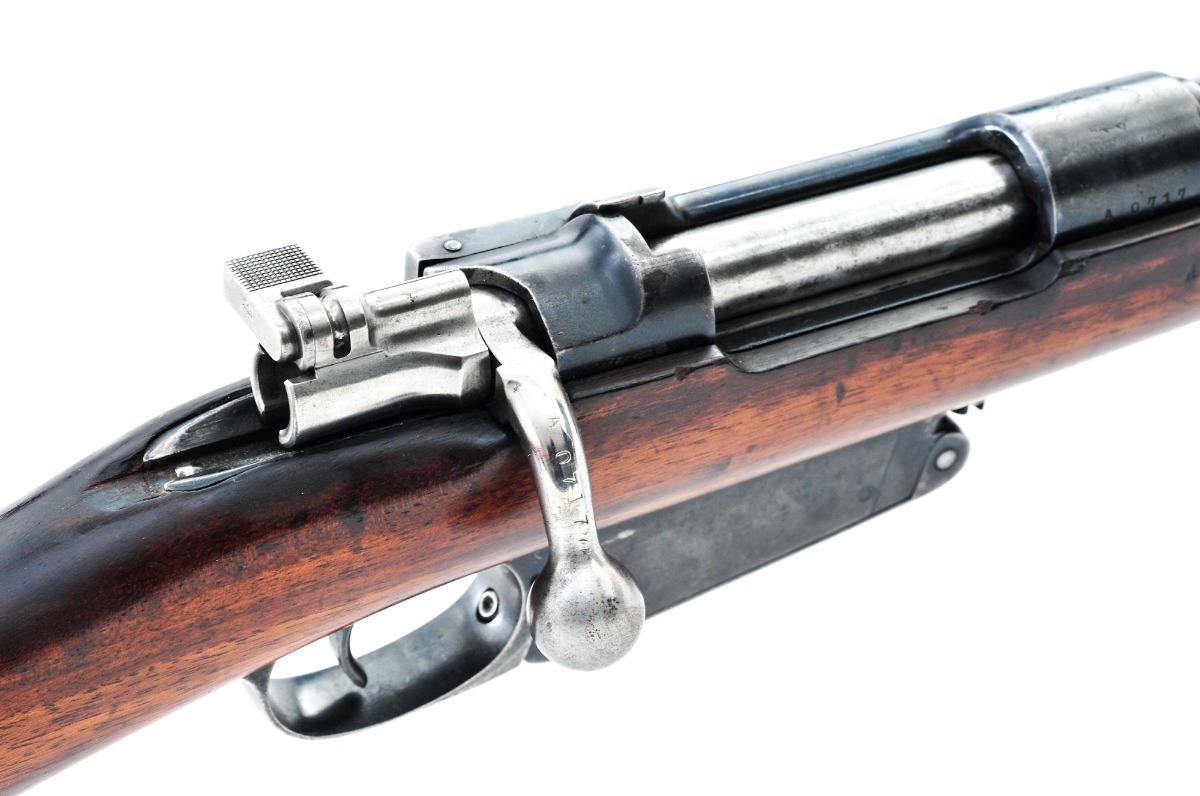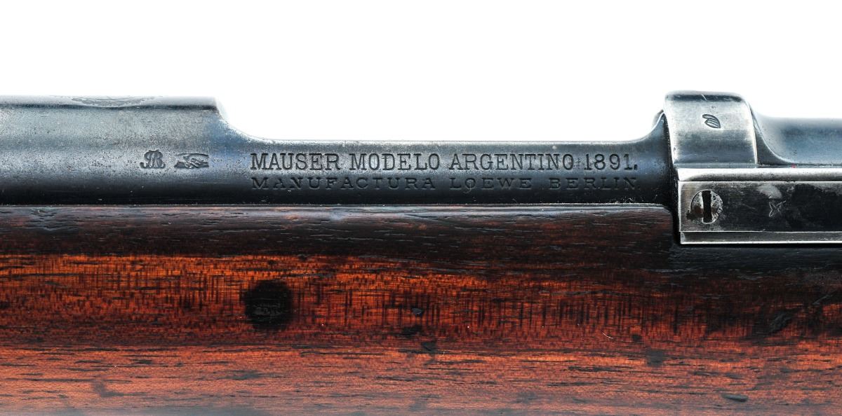 Argentine Mauser Model 1891 Bolt Action Cavalry Carbine, by Lowe, Berlin, #A0717, 7.65-53mm, 18'' barrel, blue finish, smooth walnut full-length stock, with Argentine proofs on many parts. Argentine crest is scrubbed. Condition is very good+ retaining approx. 80%original blue above the wood line. All visible numbers match including the stock. Stock is in excellent condition with minor dents, handling marks, and oil stains, and a small area of loss near the right side muzzle. Action is tight, bore is bright with slight frosting that may clean. Est.: $600-$800. (Antique)