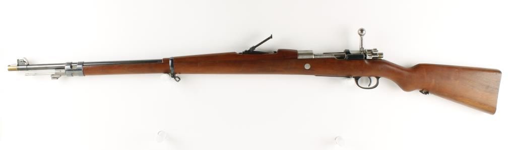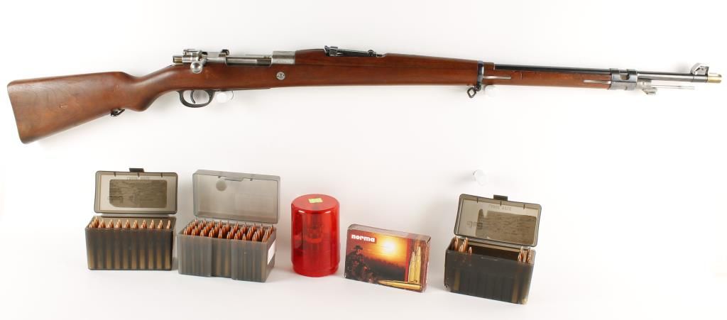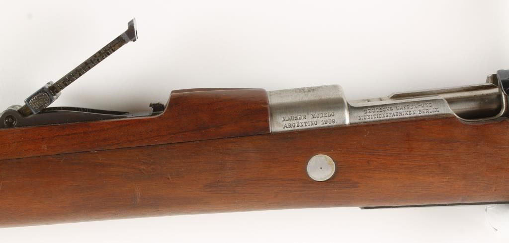 Argentine military bolt action rifle with 29" barrel. Made in Germany by DWM. Near full length pistol grip wood stock with half length handguard, tangent rear sight graduated to 2,000 meters and bayonet lug. All matching numbers including cleaning rod and muzzle cover. Includes reloading dies and 100+ rounds of loaded ammo. Condition: Excellent very good markings, not many better than this one.