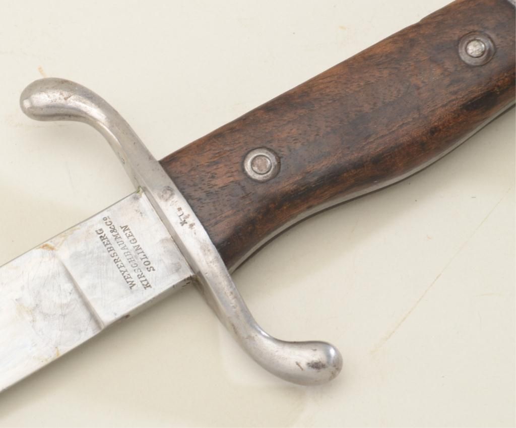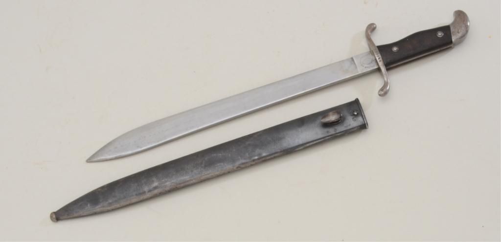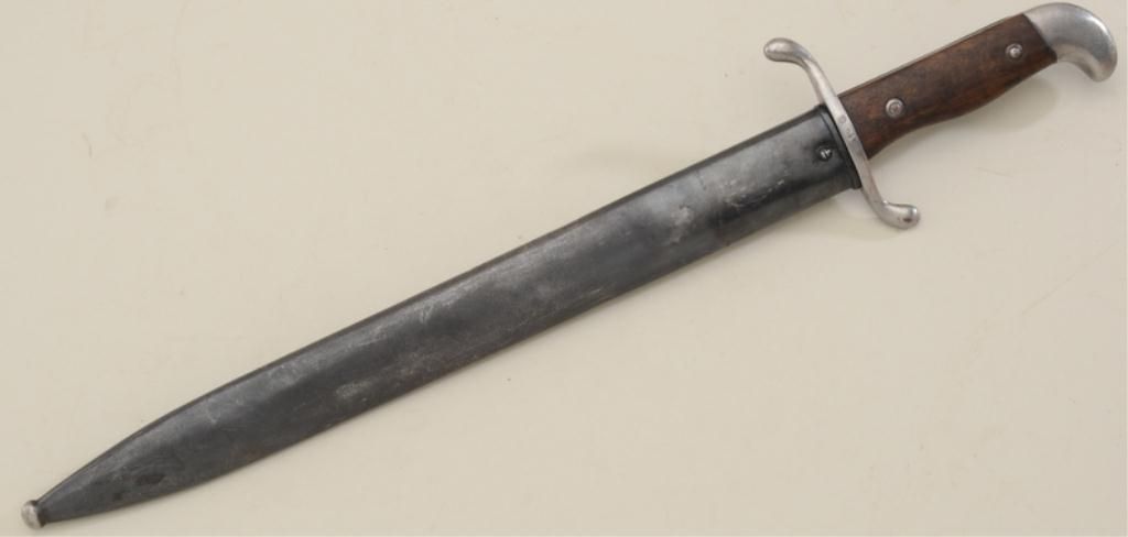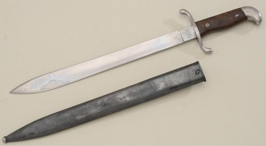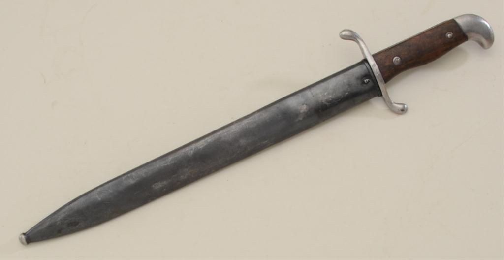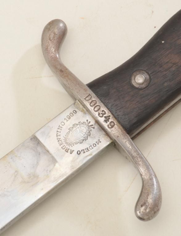 Argentine Mauser bayonet and metal sheath in overall good condition showing “Modelo Argentino 1909” on hilt, by Weyersberg #D00349 in good condition with matching serial numbered metal sheath. Est.:$75-$150.